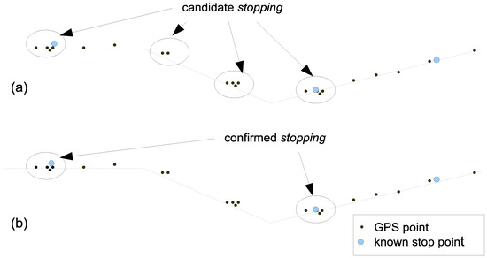 The extraction of stopping interactions considers the locations of stop points (e.g., bus or tram stops) along the route as context elements. The objective is to extract actual occurrences of stopping at these context elements. The consideration behind the process is the fact that the initially moving object stays in the neighbourhood of the context element for at least a specified amount of time. We implement the extraction of stoppings in two steps following the approach in [22]. In the first step, considering that a normal position recording will produce more closely located points during a stopping, we adopt a form of density-based clustering to extract candidate stoppings (See Figure 2a). The parameters for this clustering are set based on the characteristics of the data. In the second step, we check and discard all candidate stoppings obtained from the first step which do not lie within the neighbourhood of a known stop point (See Figure 2b).