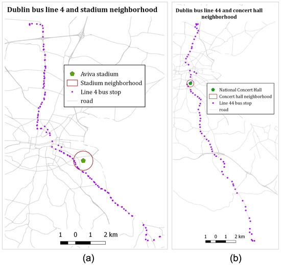 Location of context elements: (a) line 4 bus stops and Aviva stadium; and (b) line 44 bus stops and the National Concert hall.