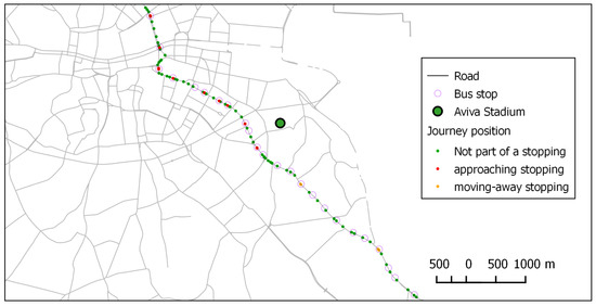 For extracting approaching and moving-away interactions, we used the distance along the route from the reference bus stops as explained in Section 3.2.1. If the distance from the reference point to the current point is smaller than the distance to the immediate preceding point the current point is on the approaching section, otherwise it is on the moving-away section. An example of the result of interaction extraction is shown in Figure 4. On the journey segment shown each position has been identified either as not part of a stopping, or as part of an approaching stopping, or as part of a moving-away stopping.