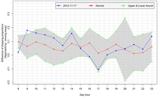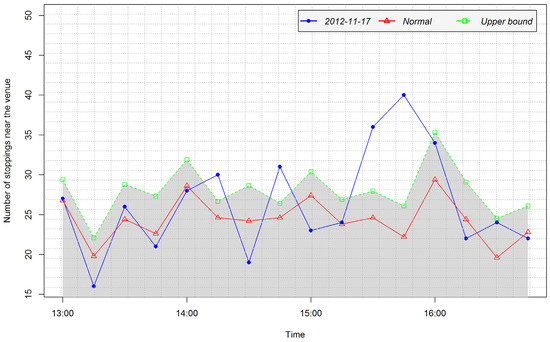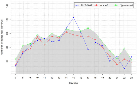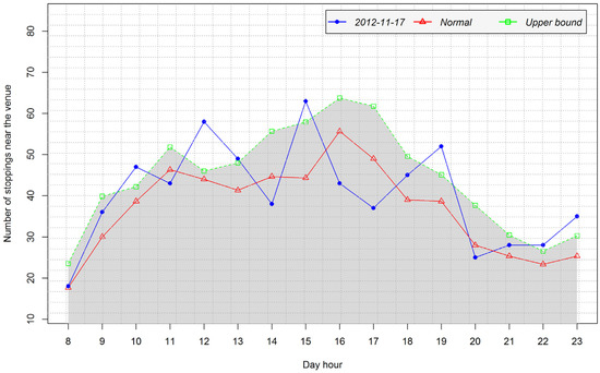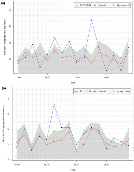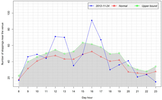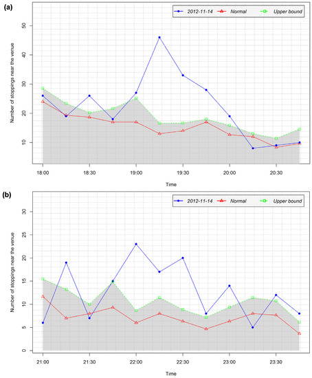 Different big events may show different temporal patterns of arrival and departure of attendees. For example, unlike the attendees of the event on 24 November 2012 who arrived on time and departed as soon as the event ended (see Figure 10), the attendees of the event on 14 November 2012 kept arriving after the start of the event, as shown by the number of stoppings near the venue that remained above the upper bound for some time after the peak (see Figure 11a). Attendees of the latter event also departed progressively, as shown by the number of stoppings near the venue, which remained above the upper bound during a long time interval after the peak (see Figure 11b).
