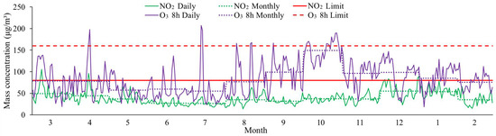 Variation of mass concentration of NO2 and O3 8 h in Shenzhen from March 2013 to February 2014.