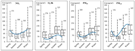 In order to investigate the seasonal variation pattern of each air pollutant, the seasonal average and quartile (minimum, 25% quartile, 50% quartile, 75% quartile, and maximum) concentrations were calculated and are displayed in Table 2 and Figure 4. For NO2, the highest value appeared in winter with a seasonal average of 60 μg/m3 and the averaged concentration levels ranked from highest to lowest as: winter, spring, autumn, and summer. For O3, the highest value appeared in autumn with a seasonal average of 63 μg/m3 and the averaged concentration levels ranked as: autumn, winter, spring, and summer. For PM10 and PM2.5, the highest values both appeared in winter with a seasonal average of 70 and 81 μg/m3, respectively, and the averaged concentration levels ranked consistently as: winter, autumn, spring, and summer.