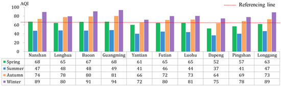 Seasonal average AQI in Shenzhen districts from March 2013 to February 2014 (referencing line represents the averaged AQI value which is 66 during the study period in Shenzhen).