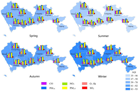 On the basis of understanding the spatial patterns of single air pollutants, regional air quality and pollution levels were further evaluated comprehensively in this section. Shenzhen is divided into 10 administrative districts. Seasonal AQI and relevant IAQIs were calculated for each district (Figure 8 and Figure 9).