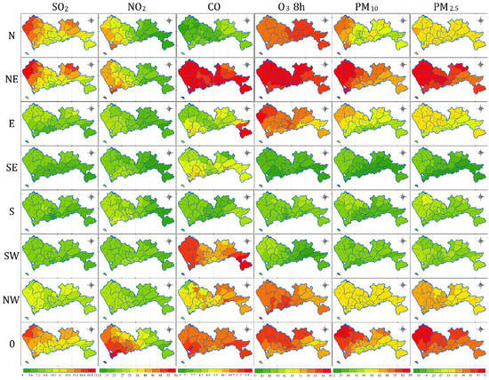 To explore how the wind direction correlated with air pollutants, all days in the study period were classified into eight categories in terms of eight wind conditions, north (N), northeast (NE), east (E), southeast (SE), south (S), southwest (SW), northwest (NW), and no wind (0). The classified results are represented in Figure 10. It is evident that the concentration values are the highest for all six air pollutants on the days with a northeast wind; the second highest concentration values appeared on the days with no wind. The concentration values on days with north-related winds are higher on average than those on days with south-related winds. The last finding is also in accordance with the seasonal variation caused by a monsoon climate.