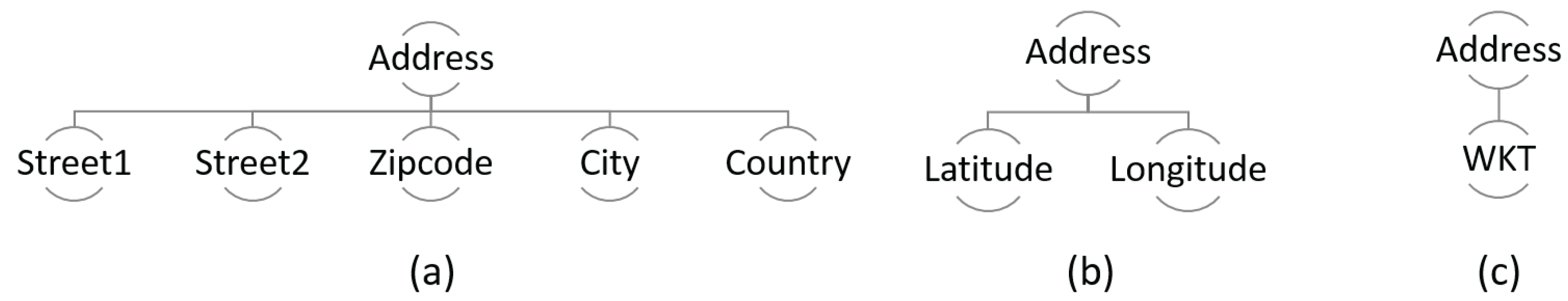 Figure 1a shows a model that combines the attributes Street1, Street2, Zip-code, City and a Country to represent an address. Figure 1b shows the address as a combination of latitude and longitude values, while the final Figure 1c shows a WKT (http://www.opengeospatial.org/standards/wkt-crs) (well-known text) representation of the same entity.