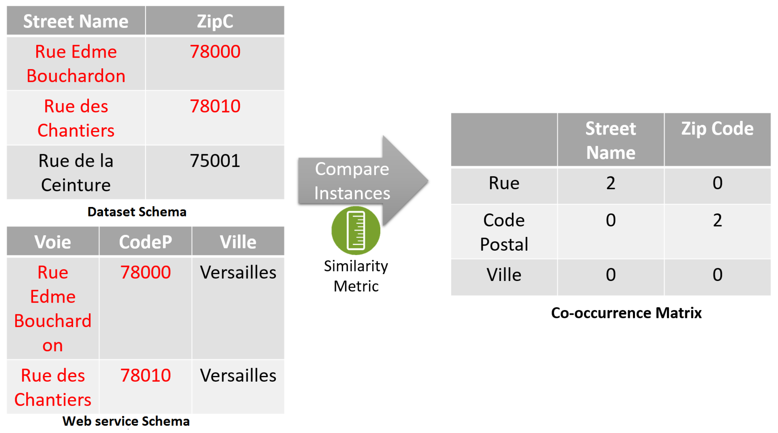 The element comparison is done via a similarity metric [46,47] in which each time a similarity is detected, the corresponding value in the matrix is incremented by one. The higher the value is, the higher the probability that these two columns map to each other. An example of what precedes is shown in Figure 5 with the elements in red representing common occurrences. We see two schemas, one representing a dataset schema and the second representing the web service schema. In the dataset schema, a street is represented by its name and zip-code written in English words, while it is in the web service schema represented by the set {Voie, CodeP and Ville} that stands for {Street, Postal code and City} in French. The co-occurrence matrix lists the columns of both schemas as rows and columns of the array, and each element in the matrix represents the number of times the same value appears in row/column combination. For example, we see that the columns “Voie” and “Street Name” have two values in common, which are “Rue Edme Bouchardon” and “Rue des Chantiers”. To calculate the matrix, we first iterate over each row in the dataset and compare the value of each column with the column values of each row in the web service results. If the similarity between the values exceeds a threshold, the value at the specific row/column index in the matrix is incremented, e.g., if the value at Street Name is similar to the value at Rue, then the cell corresponding to column Street Name and row Rue is incremented.