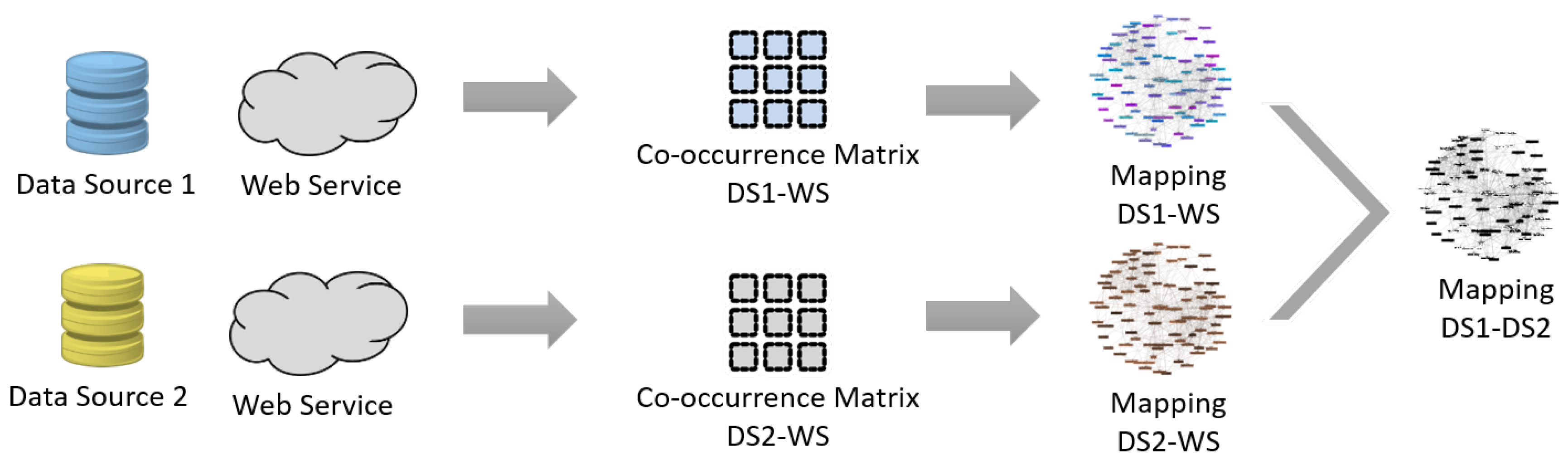 Summing up, the idea is to query each dataset element with a web service that has a known schema and inner mapping rules. We then use the resulting instances to create co-occurrence matrices for each dataset. The matrices are then used to define a matching between each dataset and the web service schema until finally using the inner mapping rules of the web service to create matching rules between the input datasets.