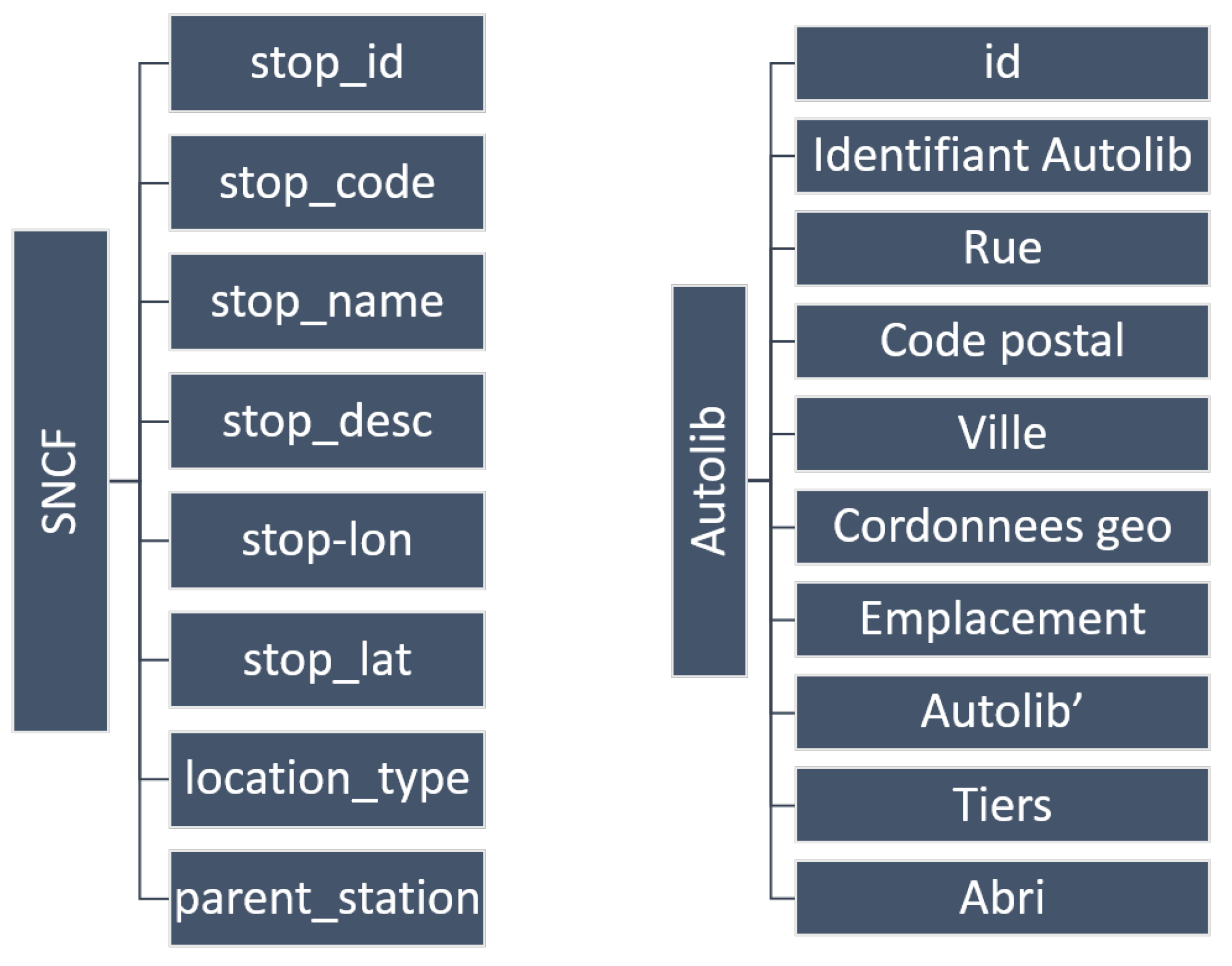 The input data are collected from the open data portals for SNCF (http://gtfs.s3.amazonaws.com/transilien-archiver_20160202_0115.zip) and Autolib (http://opendata.paris.fr/explore/dataset/stations_et_espaces_autolib_de_la_metropole_parisienne/) in CSV representations. The number of instances in each of the SNCF and Autolib datasets is 1067 and 869, respectively. Figure 8 shows the original schema of the datasets.