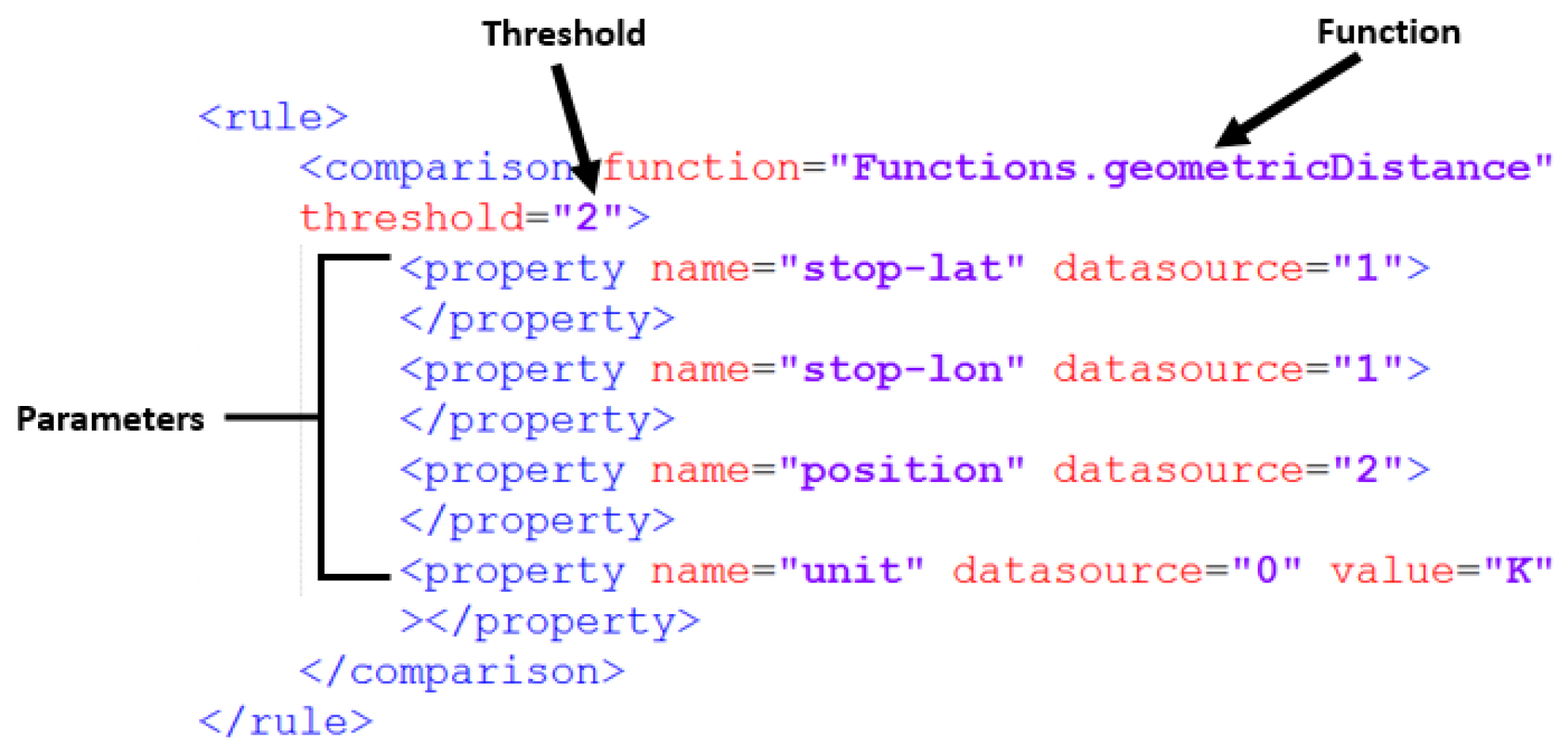 Finally, the comparison operator is used to define the similarity (or the relatedness) between two properties of the given data sources. A comparison is valid between operators themselves or with other transformation functions, and a threshold defines whether the value is accepted or not for the rule to be valid, e.g., distance, equality, etc.