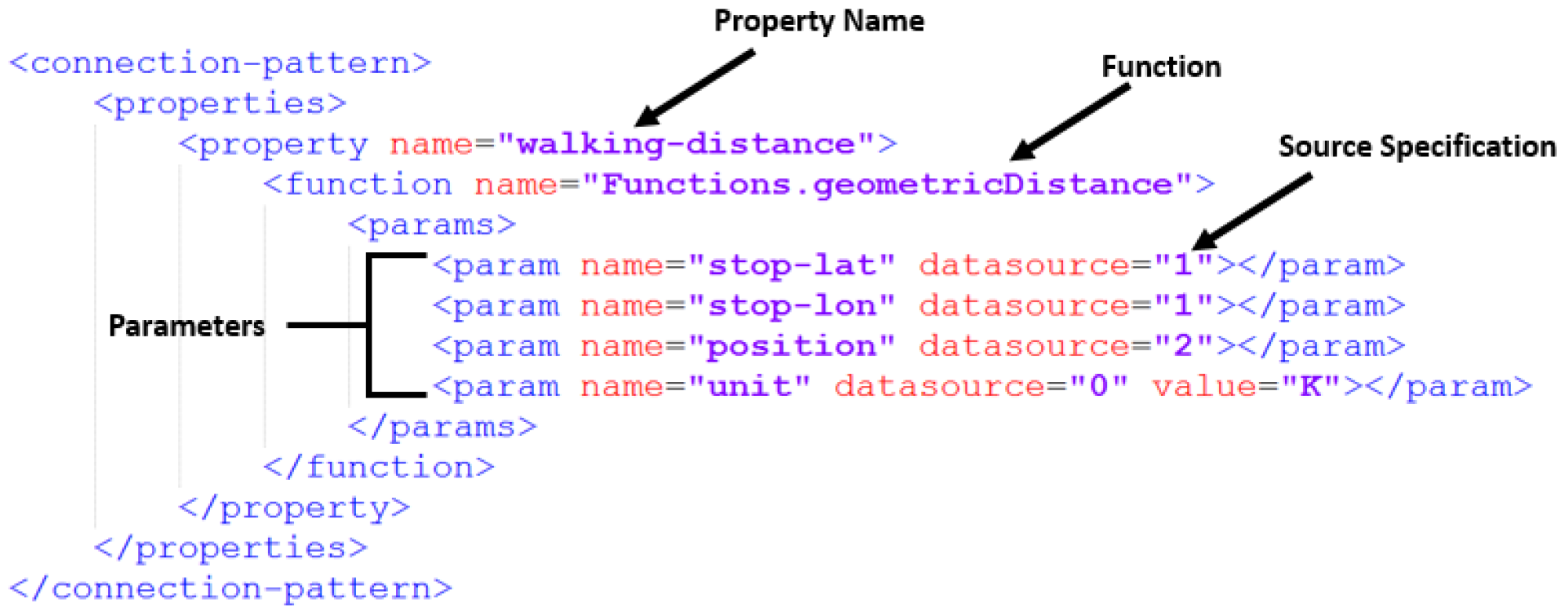 - Define the linking rules: Recall that the linking rule describes the condition that triggers the creation of a connection. Two rules are required, one for Autolib-Autolib and the other for Autolib-SNCF. For the first one, the condition of the defined rule is the following: “If a driving path exists within 200 km (the time before the battery is totally discharged), create a connection”. For Autolib-SNCF connections, the rule is: “If a walking path exists from one stop to another within one kilometer, create a connection”. Rules are written in XML format, and the functions that calculate the walking distance and time are referenced from the custom functions file. We note that the parameters “200 km” and “1 km” are given by the user who is responsible for the configuration. We set these parameters as the maximum feasible scope for a person to ride the car or walk from one station to another. Figure 9 shows an example of how a rule can be defined.
