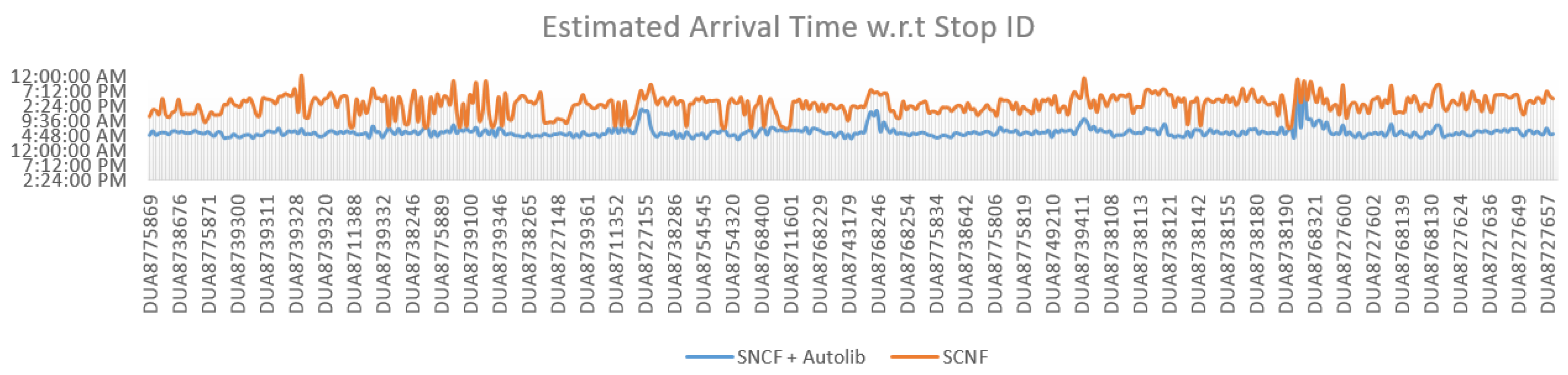 We fed our new algorithm with both scheduled and unscheduled connections and tested the estimated arrival time for each stop. To check the effects of introducing generated connections, we have calculated the estimated arrival times with and without them, and we have compared the results. Figure 11 represents the estimated arrival time for every stop starting from the SNCF departure stop DUA8711617. The intuition is that the lower the value, the earlier a passenger can reach a stop point starting from a departure station.
