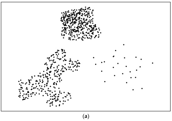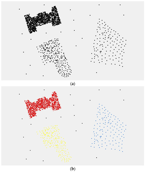 We manage multi-density objects with noises using the CDHC algorithm in experiment 2. The first experimental data are multi-density objects without noise, as shown in Figure 7a, and there are three geospatial point sets with different densities. The CDHC algorithm is used to process the multi-density points with the initial parameter of α = 1.75. The clustering result is shown in Figure 7b.