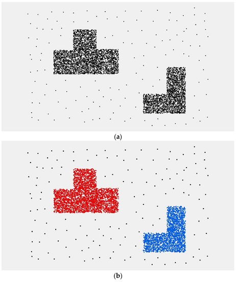 The experiment is designed to test the effectiveness through comparison of different calculation results. A set of points with edge noises, as shown in Figure 6a, are chosen as the experimental data. It is clear that there are two point clusters, which are surrounded by noisy points. The CDHC algorithm is used to cluster the experimental data with the initial parameter of α = 1.45 and the clustering result is shown in Figure 6b.