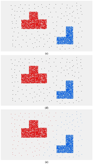As shown, the CDHC algorithm identifies multi-density objects well. To clarify this point further, two other experiments are carried out using CDHC algorithm, while the CBDT algorithm, DBSCAN algorithm and another common clustering algorithm, K-means, were taken as comparisons. For multi-density objects and noise, these algorithms share many characteristics; therefore, the two experiments are to test sufficient separation of the multi-density objects from noise. There are two clusters in one of the experimental data with abundant noise in Figure 8a, and the other experimental data are multi-density objects with a little noise, as shown in Figure 9a. The cluster analysis has been applied to the experimental data using CDHC, CBDT, DBSCAN and K-means algorithms.