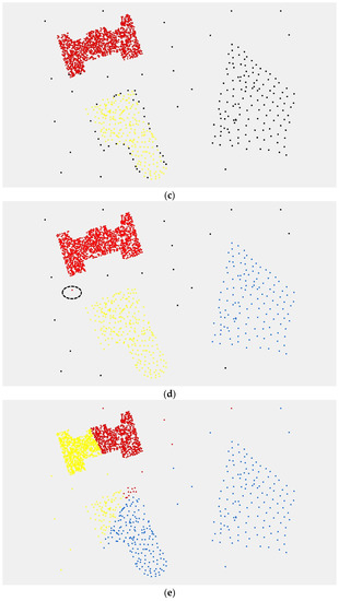 Li [24] proposed the clustering algorithm based on Delaunay triangulation (CBDT). The clustering of the experimental data using the CBDT algorithm is accomplished in three steps. First, the Delaunay triangulation is constructed for the point set. Second, all triangles are classified into three categories, i.e., small triangles, long–narrow triangles and big triangles, according to the ratio of the triangle area to the side length. Finally, the clustering result is generated by deleting long–narrow triangles and big triangles. Figure 6d shows the Delaunay triangulation of the experimental data. Figure 6e shows the clustering result using the CBDT algorithm with K = 2.5 (K is the ratio of the longest side to the shortest side of the triangle).