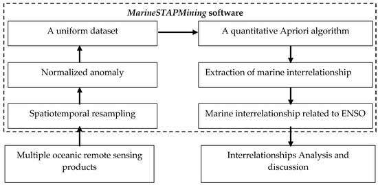 The quantitative Apriori algorithm and the preprocessing of remote sensing products have been integrated into the Marine Spatiotemporal Association Patterns Mining System (MarineSTAPMining) software, which is registered by the National Copyright Administration of P.R. China (No. 2014SR013444), developed by the authors. The experimental hardware environment includes an Intel core i7 CPU at 2.80 GHz, a 500 GB hard disk, and 4.0 GB of memory. Under this computational environment, each grid pixel within the PO was discovered one by one to obtain the association patterns among marine environmental parameters and ENSO events. Only the association patterns found to have a causal relation with ENSO are discussed in this manuscript. Figure 1 shows a flowchart of this manuscript.