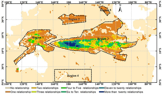 Each grid pixel within the raster dataset has zero to several association patterns. It was assumed that those grid pixels with more association patterns are more interactive. That is, the more the number of the association patterns in each grid pixel, the more interactive the grid pixel. According to the number of association patterns in each grid pixel and its spatial connectivity, Figure 2 is drawn. From Figure 2, five such interactive regions are found. They are the western PO (Region 1), the central and eastern tropical PO (Region 2), the middle of the northern subtropical PO (Region 3) in the North Pacific Subtropical Gyre, the middle of the southern PO (Region 4), and the region along the California coast (Region 5). The following discussions mainly focused on the five sub-regions. Thematic maps were created to depict these findings in detail. These are shown in Figure 3 and Figure 4.