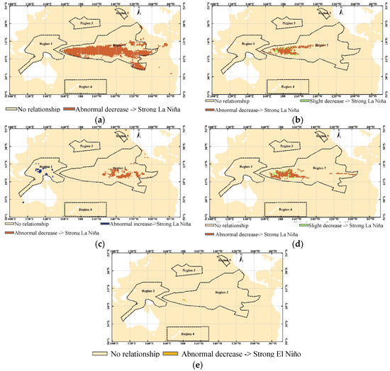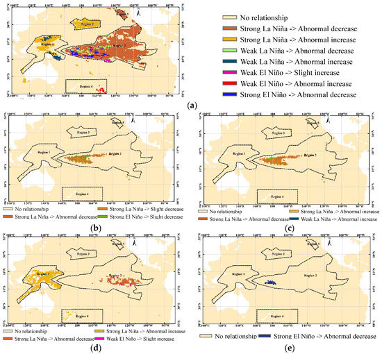 There is only one instance in which SSTA[−2]→ENSO[−2]. It is located largely in the central and eastern tropical PO, mostly covering El Niño Region 3 and Region 4 (see Figure 3a). This suggests that when SSTA drops abnormally in this region, strong La Niña events will occur. Between SSPA and ENSO, there is a positive association pattern with the forms of “SSPA[−2]→ENSO[−2]” and “SSPA[−1]→ENSO[−2]” (see Figure 3b). It covers the middle of the equatorial PO (10° S to 10° N and 160° E to 140° W) in Region 2, indicating that when SSPA drops abnormally or slightly, strong La Niña events will occur. The association pattern between SLAA and ENSO shows a positive association pattern with the form of “SLAA[−2]→ENSO[−2]” and a negative association pattern with the form of “SLAA[+2]→ENSO[−2]” (see Figure 3c). The former mainly covers the east of the equatorial PO (10° S to 10° N and 155° W to 100° W) within Region 2, meaning that when SLAA drops abnormally in this region, strong La Niña events will occur. The latter mainly displaces the western Pacific warm pool within Region 1, meaning that when SLAA rises abnormally in this region, strong La Niña events will occur. The association patterns between WSA and ENSO events (see Figure 3d) show that a positive association pattern with the forms of “WSA[−2]→ENSO[−2]” and “WSA[−1]→ENSO[−2]” occurs in the middle of the equatorial PO region (10° S to 10° N and 160° E to 150° W), meaning that when WSA in these regions drops abnormally or slightly, strong La Niña events will occur. In addition, a positive association pattern with the form of “WSA[−2]→ENSO[−2]” occurs in the east of the equatorial PO from 125° W to 95° W. Only one association pattern between CHLA and ENSO (see Figure 3e), “CHLA[−2]→ENSO[+2]” appears. It is located in a few areas in the middle of the equatorial PO, meaning that when CHLA drops abnormally, strong El Niño events will occur.