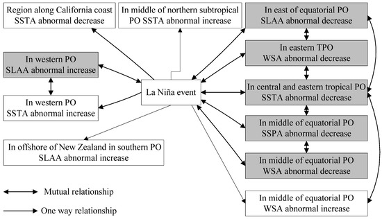 It can be seen from Figure 5 that when La Niña events occur, several effects will prevail: abnormal decrease of SLAA and WSA in the east of the equatorial PO; abnormal decrease of SSPA and WSA in the middle of the equatorial PO; abnormal decrease of SSTA in the eastern and central tropical PO; and abnormal increase of SLAA in the western PO. It can also be seen that some environmental parameters (shaded gray in Figure 5) exhibit mutual relationships with La Niña events. In these cases, when the marine environmental parameters are opposite to those outlined above, La Niña events will not occur. These association patterns indicate that abnormal changes in these parameters not only occur in response to La Niña events but also predict them.