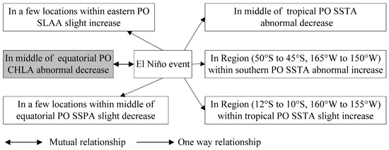 Association patterns among El Niño events and marine environmental parameters are shown in Figure 6. Mutual relationships are shaded in gray. Marine environmental parameters change when El Niño events occur, but these changes are not obviously related to each other. With the exception of the abnormal decrease in CHLA in the middle of the equatorial PO, no parameter can be considered an indicator of El Niño events. With the decreases of CHL, the SST decreases and the subsurface temperature increases by altering the penetration of solar radiation, deepening the mixed layer and thermocline. Such ocean states could intensify ENSO amplitude [21], thus the abnormal decrease of CHLA may be an indirect indicator of El Niño events.