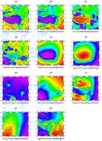 (a) Topography of the TP; (b) Moho depth of the TP; (c) sedimentary depth of the TP; (d) lithospheric depth of the TP; (e) effect of topographic masses; (f) effect of variations in the Moho interface; (g) effect of variations in the sedimentary interface; (h) effect of variations in the lithospheric interface; (i) geoid anomaly from EGM2008 to degree 180; (j) geoid anomalies from EGM2008 of degree 2–6; and (k) residual geoid anomaly after the above-motioned contributions are reduced.