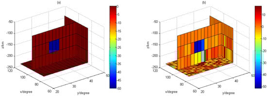 where the first term is the 2-norm of the fitting error, the condition term is the constraint, is an initial model, and is the parameter-weighting matrix because the geoid anomaly is inversely proportional to the distance from the source. To ensure that each tesseroid has the same probability according to the matrix , we use the matrix to calculate the weight in the matrix , where is the depth of each tesseroid, is a small constant to avoid singularities, is a number that changes the weight of ; is the data weight matrix; and is the vector of Lagrange multipliers. To minimize the objective function, we differentiate Equation (3) with respect to and ; by setting them equal to zero, we obtain the following solution: