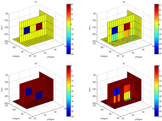 We constructed some synthetic models based on geoid-induced terms in our designed density model for testing our above-proposed method. We simulated three synthetic models (see Figure 3a,c,e). M1 is a synthetic model of a negative geoid anomaly caused by one low density (low-D) rectangular prism ranging from 150 km to 200 km in depth ( = 50 km) with horizontal dimensions of approximately 1554 km and 2109 km ( = 14, = 19°) and a density contrast of −50 kg/m3. M2 is a synthetic model of a contoured geoid anomaly caused by one low-D rectangular prism on the right and one high density (high-D) rectangular prism on the left that ranges from 600 km to 150 km in depth ( = 450 km) and has horizontal dimensions of 333 km ( = = 3°) and a density contrast of −50 kg/m3. M3 is similar to M2 but corresponds to two low-D rectangular prisms with different depths. We added 5% Gaussian random noise to the synthetic data, which are referred to as the “observed geoid data”. We implemented two tests based on two different types of models whose inversion parameters are = 0.9; = 10−4; and = 10−2. The numbers of iterations, modeling errors and fitting errors are listed in Table 1.