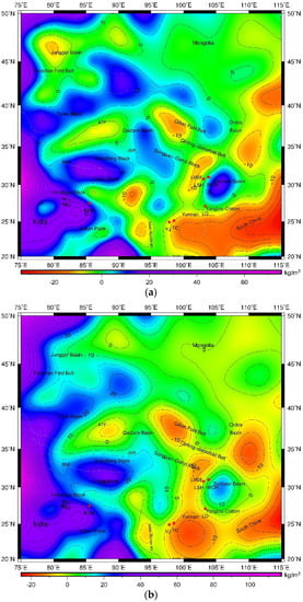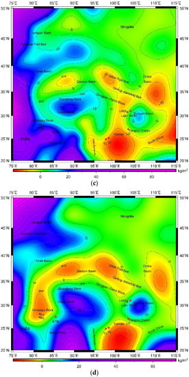We then obtain the 1° × 1° Moho interface (Figure 2b) included in the global crustal model, crust1.0 [], and the 1° × 1° lithospheric interface (Figure 2d) from the global lithospheric model, litho1.0 [], respectively. The average depth of the Moho interface is 35 km, the density contrast between the crust and the uppermost mantle is 420 kg/cm3, the average depth of lithosphere is 100 km and the density contrast between the crust and the uppermost mantle is 10 kg/cm3 []. We use the strategy described above.