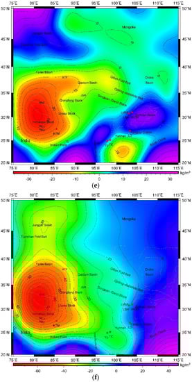 The effects are illustrated in Figure 2e–h. The contribution of the topographic masses is the largest with an amplitude of approximately 650 m. The effect of the amplitude of the basins is smaller (approximately 570 m) than that of the topography. The largest lithospheric effect is in the southwestern part of the study area and nearly 30 m. The sedimentary effects in the Sichuan, Qaidam and Indian Basins are obvious. Their amplitudes can be up to 25 m.