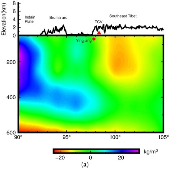 Teleseismic P-wave tomography shows that the velocities are lower in both the lower crust and the uppermost mantle under southwestern Yunnan based on regional waveform inversion []. Beneath the Yunnan region, the Poisson’s ratio is high and the crust is thin []. In our results, low-D anomalies emerge in both the crust and the lithospheric mantle (at depths between 0 and 300 km). Analogous to the velocity anomalies, low-D anomalies in the crust are the result of the extrusion of the Indian Plate and the obstruction by the surrounding hard blocks []. This results in a higher temperature and lower Poisson’s ratio in the lower crust. The low-D anomalies in the lithospheric mantle may be due to deep slab dehydration. The low-D anomalies in the MTZ are due to the subducted heavy plate. This provides forces and environments that are conducive to frequent earthquakes [,,] (such as the Wenchuan, Lushan, Ludian, and Yingjiang earthquakes) and the formation of the Tengchong volcano in this area [].