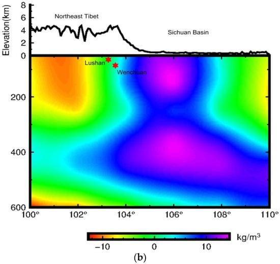 Across the first layer, density anomalies at an average depth of 50 km from the crust vary intensely. As shown in Figure 5a, in the eastern TP, low-D anomalies in the crust terminate near the Longmen Shan fault (LMSF). In the southern TP, low-D anomalies in the crust extend over a long distance. In the northern TP, crustal low-D anomalies stop beneath the ATF. These results agree well with the LVZ found by previous studies [,]. Low-D anomalies are also found in the Qilian Fold Belt. These results are in line with the high-precision underground gravity anomalies []. Additionally, low-D anomalies with the amplitudes of up to −20 kg/m3 occur in blocks on the eastern TP from north to south. Moreover, high-D anomalies with amplitudes of up to 60 kg/m3 are clustered on the western TP. From west to east in the study area, crustal high-D anomalies appear in Tianshan, the Tarim Basin, the Qiadam Basin, and the Sichuan Basin; they could be due to the hard basements in those regions. High-D anomalies can also be found in the southwestern TP (the Himalaya, Lhasa, and Qiangtang Blocks) extending downward to 300 km. An analysis of recent earthquakes (see Table 2 for their parameters) in this region showed that all of them occurred in transition zones between high-D and low-D density anomalies in the crust.
