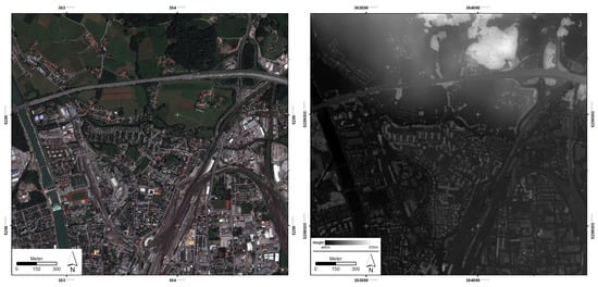 A stereo image was taken on the 28 May 2013 by the Pléiades satellite. The satellite provides high-quality image data, proven suitable for DSM generation []. The DSM (cf. right side of Figure 1) was computed at the German Aerospace Center (DLR) using the multi-stereo processing chain of the fully automated pre-processing “Catena” system []. The pansharpened satellite images have a spatial resolution of 0.7 m, and the DSM of 1 m, respectively. An airborne LiDAR-derived DSM and DEM data set from 2006 served as ground reference for validation of the result. Both LiDAR-derived data sets have a spatial resolution of 1 m, equal to the Pléiades stereo DSM. In Central-European urbanized landscapes, the terrain surface is estimated not to change significantly. Hence, the gap in time between the two data sources does not hamper the validation.