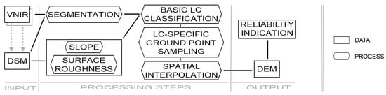 The proposed workflow for object-based DEM generation is outlined in Figure 2. The processing steps—including raster layer analysis, vector-object generation, and classifications based on defined rules—were programmed in CNL (cognition network language) within the eCognition software development environment (Trimble Geospatial) []. The workflow comprised two major steps: (1) a basic land cover classification based on spectral and DSM values; and (2) a sampling of ground points stratified by the land cover classification []. Together with the VNIR images, the DSM served as input for the multi-resolution segmentation [] to define regions of similar spectral information and similar height. A coarse delineation of homogeneous objects was sufficient due to the generic characteristics of the applied land cover classes.