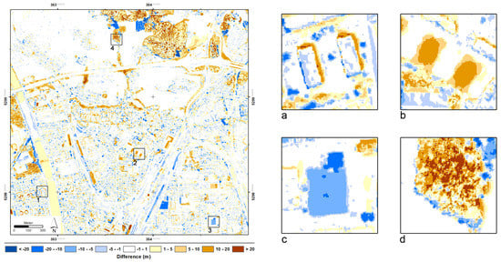 Left: Difference map showing height variation of the stereo-imagery DSM in comparison to the Light Detection and Ranging (LiDAR) DSM: blue colors represent areas where the stereo-imagery DSM is lower than the LiDAR DSM, brown colors denote areas where the stereo-imagery DSM is higher than the LiDAR DSM, and white areas are in the range of [−1/+1 m] difference; Right: Close-ups of the error map depicting (a) vertical residuals of the stereo DSM around buildings, (b) new buildings, (c) removed buildings, and (d) height differences in a small forest stand.