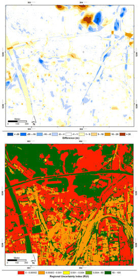 Further research and improvement of the approach will be conducted with regard to two aspects: (1) in the course of the analysis, it became apparent that a more sophisticated investigation of the spatial distribution of ground points with point pattern analysis (e.g., average nearest neighbours (ANN), Ripley’s K) could complement the proposed RUI. Hence, an additional uncertainty indication could be provided. (2) The approach already tries to minimize the parametrization (user-algorithm interaction) of the initial land cover classification, since only a rough land cover classification is needed. This could be further investigated. Fully automated parameter-free pre-classification methods should be taken into account to increase the potential transferability of the approach (e.g., Baraldi et al. []).