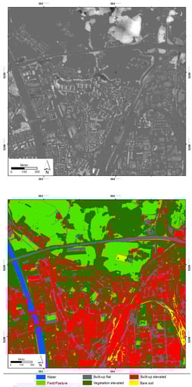 The study area for this research was the northern part of the city of Salzburg, Austria, as shown on the left side of Figure 1. The extent was about 2.5 km by 2.5 km. The area is mainly characterized by built-up area features, but also includes some urban vegetation, agricultural land, and forests. The terrain of the area is flat with a hillslope in the north (cf. right part of Figure 1).