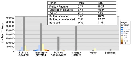 The RMSE histogram was calculated for each class separately (cf. Figure 7) []. The lowest RMSE values were observed for “Fields/Pasture”, “Built-up non-elevated”, and “Bare soil”. They represent the quality of the stereo DSM compared to the LiDAR DSM, since the original stereo DSM was taken for these classes. This underpins the basic land cover classification quality for these areas.