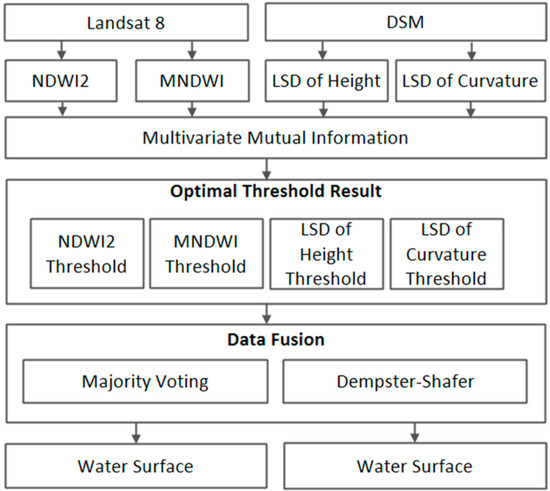The aim of this study was to further improve water area classification, in terms of both accuracy and precision, from Landsat images by considering information mutually shared with topographic derivatives. To this end, the MMI of the NDWI2 and MNDWI water indices and local standard deviations (LSD) of height and curvature per the DSM data were optimized to determine suitable thresholds for respective attributes. The water surfaces, as observed from these tools, were then fused by means of majority voting and Dempster–Shafer methods. The extraction results from these decisions were subsequently validated against manual digitizing. This process is summarized in Figure 1.