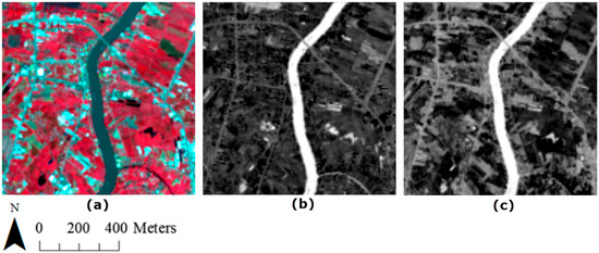 (a) Landsat 8 images interpolated at five-meter spatial resolution; and corresponding water index images: (b) MNDWI (Modified Normalized Difference Water Index); and (c) NDWI2 (Normalized Difference Water Index 2), of an area sampled in 2015.