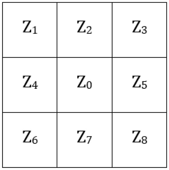 The curvature feature describes the convexity or concavity of a surface. The value can be positive, negative, or zero, representing concave, convex, and flat areas, respectively. For leveled water, this value is close to zero. The same may apply to any flat terrain. However, in DSM, water curvature appears to have a lower standard deviation. In this study, profile curvature was computed using Equation (8), based on a 3 × 3 neighborhood (Figure 3).