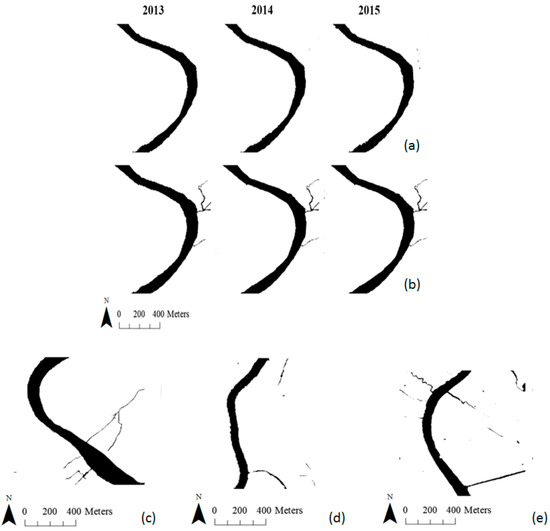 Water extraction results in Pathumthani for image one in 2013 to 2015 using: (a) Majority Voting; and (b) Dempster–Shafer. (c) Image two. (d) Image three; and (e) image four obtained in 2013 by Dempster–Shafer.