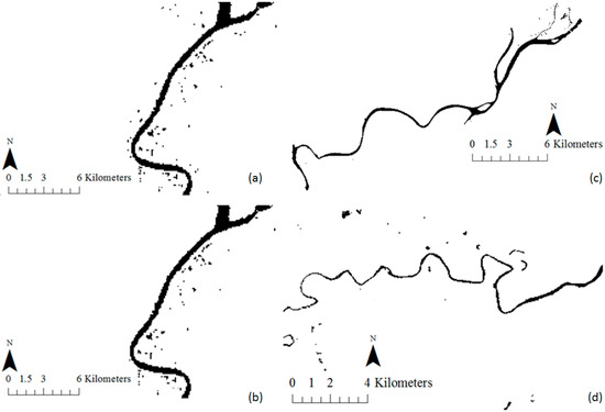 Water extraction results for the Pak Phanang River in Nakhon Si Thammarat) using: (a) Majority Voting; and (b) Dempster–Shafer. (c) The Tapi River in Surat Thani; and (d) the Lang Suan River in Chumphon using Dempster–Shafer.