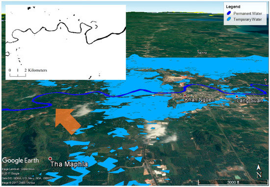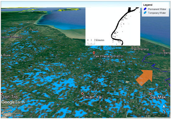 To demonstrate the potential for this technique to be applied to monitoring, a similar approach was used for the selected areas when the flooding occurred, from which their respective rivers were subtracted. The major flood incidents were reported in November 2011 for Pathumthani and in January 2017 for the remaining cities. The resultant overlaid flood maps are depicted in Figure 8, Figure 9, Figure 10 and Figure 11, where the dark and light blue indicate the permanent water or river and temporary water, being the flooded areas, respectively. The orange arrows indicate the locations of extracted images in the inset.