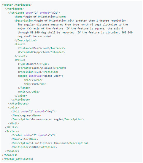 In addition to instance and class level attributes, one can use the “Extended-level” attributes. There are two XML files to define CDB extended attributes: Geomatics (for geospatial attributes whose governed by standard organizations), and Vendor (for attributes whose are governed by one or more vendors) Attributes. The intent behind those XML Attribute files is to provide the data necessary to interpret feature attributes. The following example illustrates how to define an extended attribute (Figure 8).