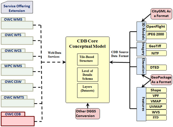 The perspective of the future OGC CDB core module is presented in Figure 12. The goal of this conceptual model is to provide a core model, which can be aligned with other OGC standards baseline. For example, the OGC web or data services can be encoded to specify a fully configured service set which can be exchanged (with a consistent interpretation) among clients. There are no limitations on certain types of processes or data. Also, City GML and Geopackage can be integrated into CDB as a new data source. Another topic which can be considered in CDB is to provide support for converting WGS 84 into other Discrete Global Grid Systems (DGGSs) or coordinate reference frames. The critical issue which needs a careful attention for the future version of CDB is that all the extension and conversion mechanism have to run in real-time. Therefore, a detailed performance test is required to investigate the run-time synthetic environment generation capability of each additional modules.