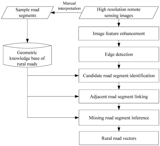 In high-resolution remote sensing images, rural roads have typical image characteristics of roads as other types of roads such as urban roads and highways, but also have unique characteristics including material diversity, large curvature, and a severe shelter problem. Therefore, for automatically identifying rural roads from high spatial resolution images, the geometric features especially linear features should be major consideration factors while the spectral features are secondary factors. Based on this idea, this paper constructs a geometric feature knowledge base of rural roads, and uses it to guide the process of road extraction. The overall workflow of road extraction is shown in