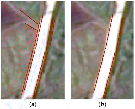 30]: two edges are approximately parallel; the distance between two parallel lines is the width of the road; the edges consist of straight lines and curves, but straight lines account for a major proportion. Based on the above rules, we calculate the index that any two straight lines conform to the characteristics of road edges, and then select the parallel line pair with a maximum grouping index as a candidate road segment. We use
