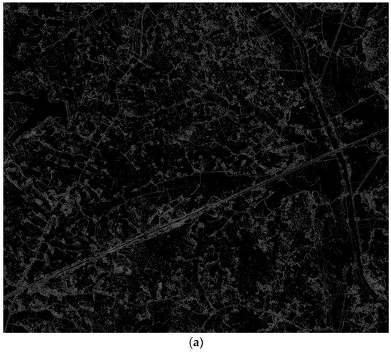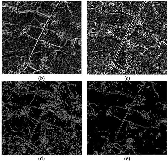 Figure 14b,c, so they are not suitable for road detection. The Canny operator is able to detect thin edges from images with high accuracy; however, it would generate significant background noise while detecting weak edges, as shown in