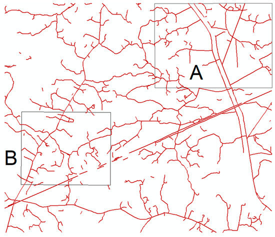 . Considering that roads in rural areas have large curvature changes, we assign a relatively low weight to the direction consistence indicator, so the weights of the width similarity index, direction consistence index, and adjacency index are recommended to be set to 0.4, 0.2, and 0.4, respectively.
